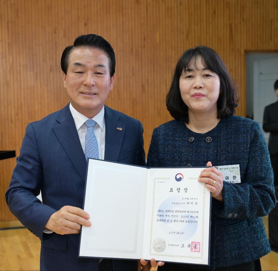 24일 논산발그래일터 허미란 실장 표창장 수여사진. 왼쪽부터 백성현 논산시장(대리수여), 허미란 실장.jpg