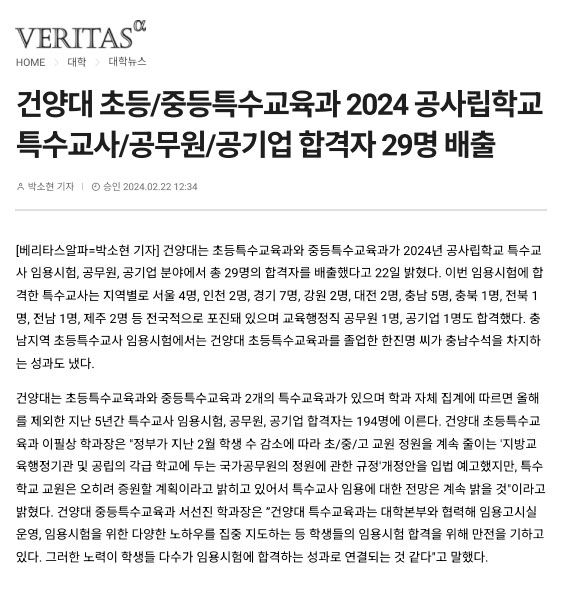 | 제목 | [신문기사] 건양대 초등/중등특수교육과 임용시험 등 합격자 29명 배출 | ||||